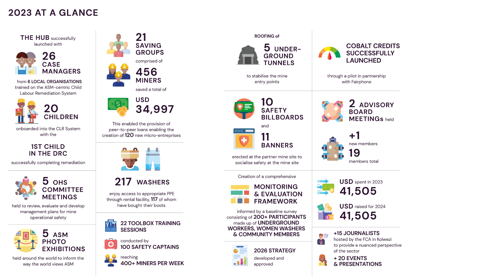 The Fair Cobalt Alliance (FCA) remains steadfast in its commitment to nurturing a responsible and equitable artisanal cobalt sector in the Democratic Republic of Congo (DR Congo). As we reflect on the past year, 2023 emerges as a pivotal period led by significant changes in the global cobalt market.